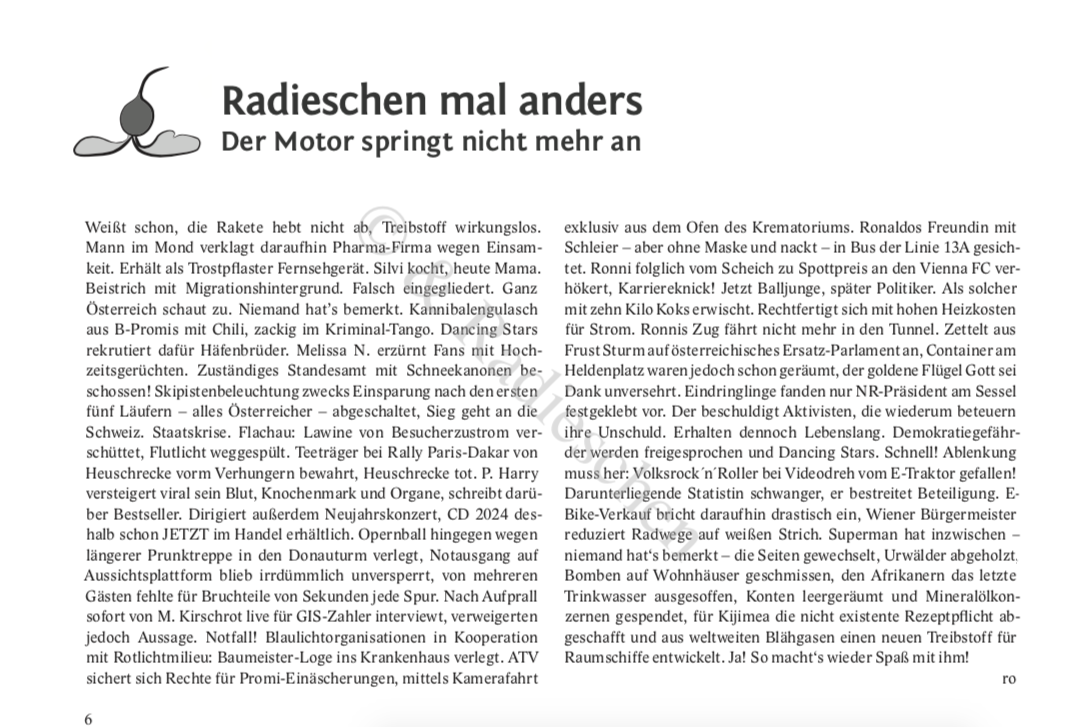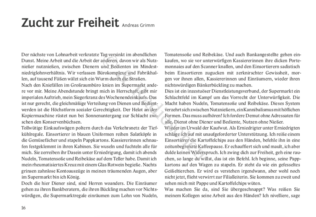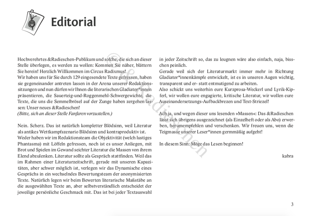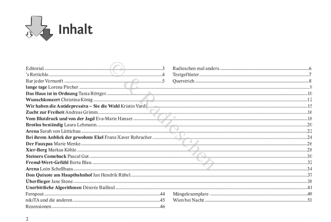 Mit literarischen Beiträgen von: Désirée Baileul, Berta Blau, Andreas Grimm, Pascal Gut, Eva-Marie Hanser, Markus Köhle, Christina König, Laura Lehmann, Sarah von Lüttichau, Marie Menke, Lorena Pircher, Franz-Xaver Rohracher, Tania Röttger, Jan Hendrik Rübel, Leon Schellhaas, Jane Stone und Kristin Vardi sowie Kolumnen der Redaktionsmitglieder und Rezensionen.