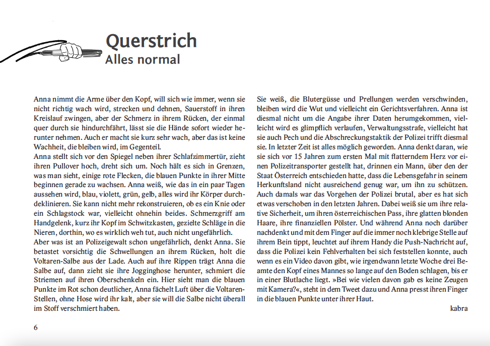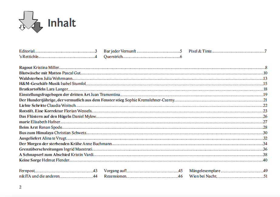 mit literarischen Beiträgen von: Anne Buchmann, Helmut Flender, Pascal Gut, Elisabeth Hafner, Sophie Kremslehner-Czerny, Lara Langer, Kristina Miller, Christian Schwetz, Ingrid Maestrati, Daniel Mylow, Renan Spode, Isabel Stumfol, Juan Tramontina, Kristin Vardi, Alina te Vrugt, Julia Wehrmann, Florian Wessels und Claudia Woitsch …