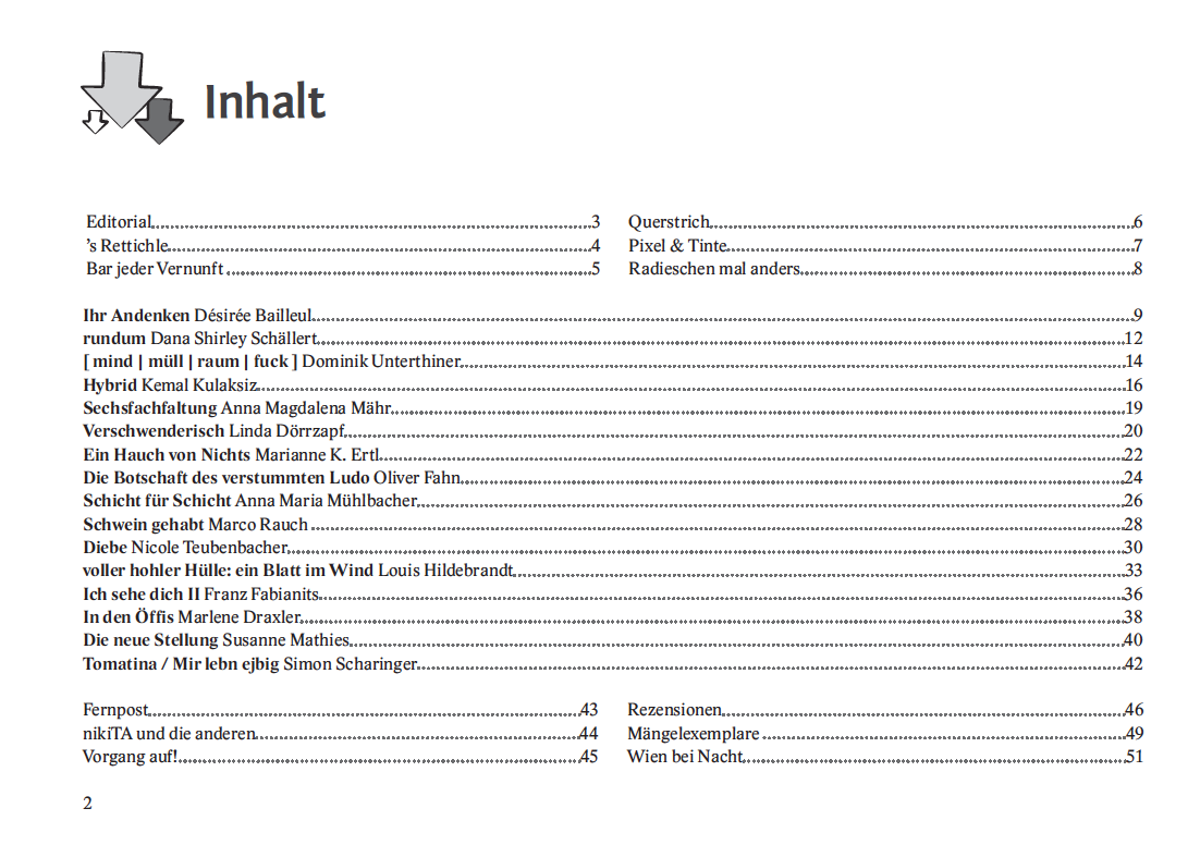 mit literarischen Beiträgen von: Désirée Bailleul, Linda Dörrzapf, Marlene Draxler, Franz Fabianits, Marianne K. Ertl, Oliver Fahn, Louis Hildebrandt, Kemal Kulaksiz, Anna Magdalena Mähr, Susanne Mathies, Anna Maria Mühlbacher, Marco Rauch, Dana Shirley Schällert, Simon Scharinger, Nicole Teubenbacher, Dominik Unterthiner