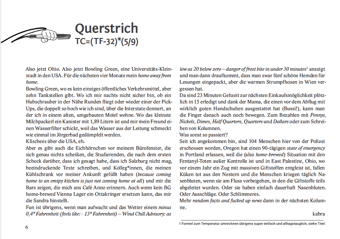 Kolumnen von: Katherina Braschel, Katharina J. Ferner, Peter Heissenberger, Elias Hirschl, Armela Madreider, Fabian Navarro, Nikita und Andreas Plammer