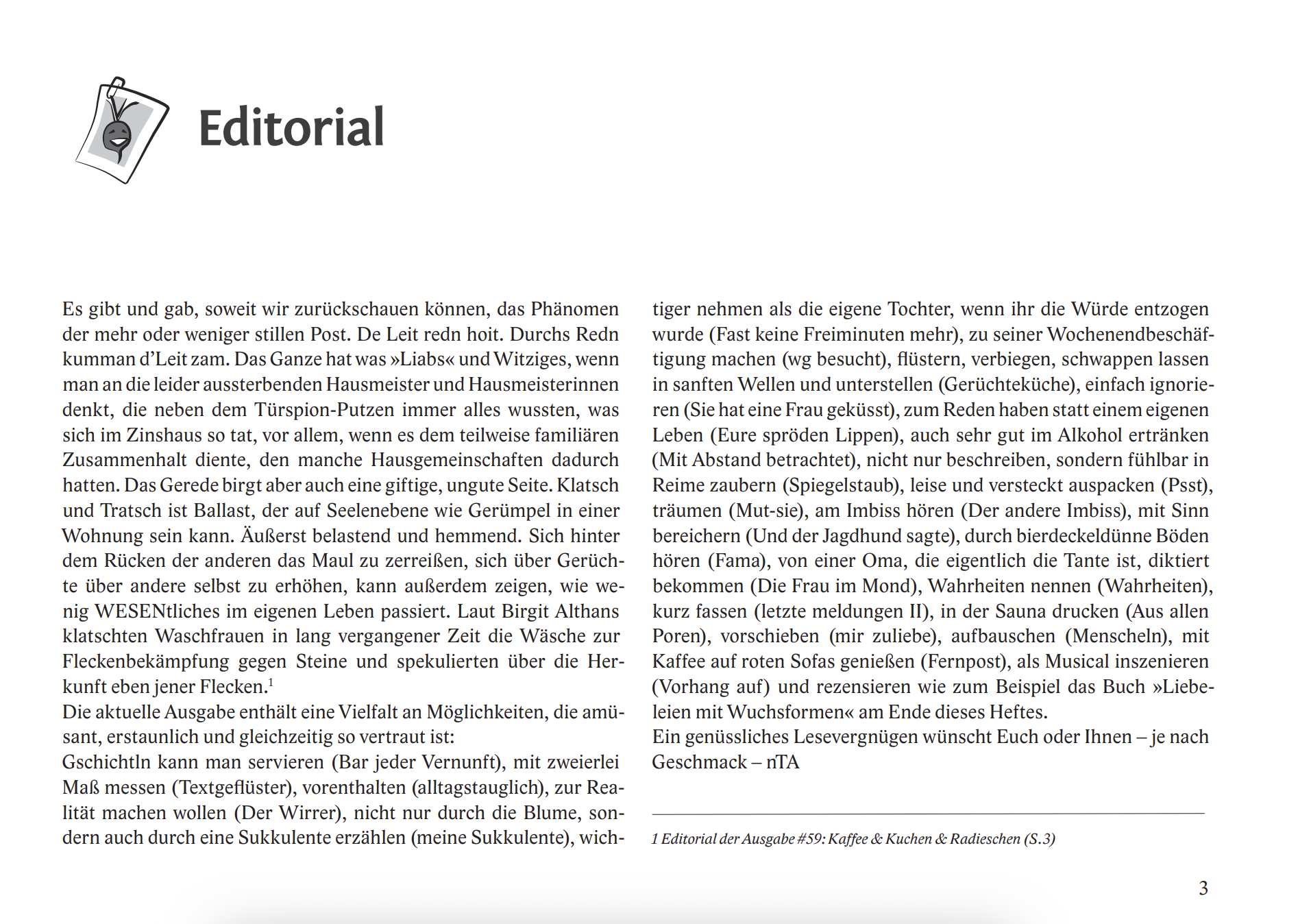 Die Ausgabe #74 mit dem Titel Klatsch & Tratsch erscheint Ende Juni 2025. Insgesamt wurden diesmal 266 Beiträge zum Thema eingesandt, 19 davon konnten in die neue Ausgabe aufgenommen werden.